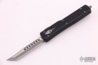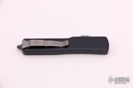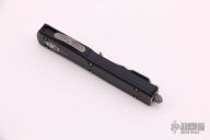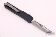 This UTX-70 OTF automatic by Microtech features an apocalyptic finished blade with a standard edge. The handle has a black aluminum frame with blasted stainless steel tip down clip. Dated 02/2020. Comes with original box and papers. Excellent condition.
