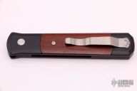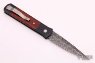 This Custom Damascus Godfather by Pro-Tech features a Robert Eggerling "Roots" pattern Damascus blade. The handle has a black aluminum frame with cocobolo inlays, mosaic pin push button, satin finished titanium pocket clip. Comes with original box and papers. Excellent condition.