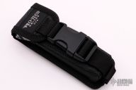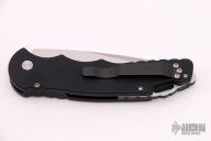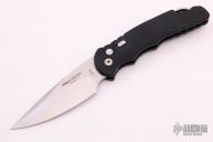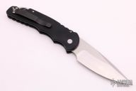 This Tactical Response 4 by Pro-Tech has a satin finished blade with a plain edge, and a black aluminum handle with mother of pearl inlaid push button. Black stainless steel clip. Steel glass breaker. Secondary safety switch. Comes with original box, sheath and papers. PR11, serial number 56. Excellent condition.