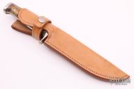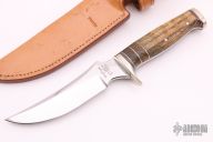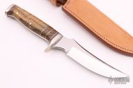 This Hunter by Al Foster features a mirror polished blade with notched thumbrest and false top edge, .196" blade stock and 1.285" blade depth, full tapered tang construction. The handle has a nickel silver guard and butt, curly oak sales with red/white/black/nickel silver spacers. Comes with a brown leather sheath. Excellent condition.