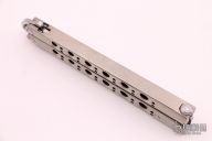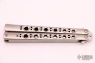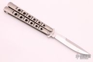 This Model 42 Balisong by Benchmade features a tumble finished blade with swedge. The handle is comprised of integral skeletonized titanium handles with spring T latch on pommel. Has some scratches on the blade and handle, otherwise good condition. Comes with a Benchmade box and nylon sheath.