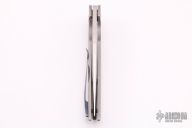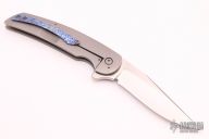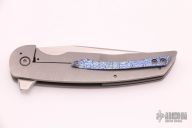 This Model 11 framelock flipper by Les Voorhies features a satin finished recurve blade with flipper. The handle has a tumbled titanium frame, timascus tip up clip and a floating zirconium backspacer. Rides on bearings, nice blade seating, detent and lockup. Comes with original box. Excellent condition.