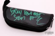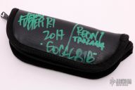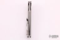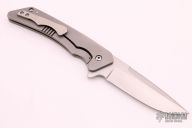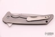 This R1 by Kevin Foster features a hand rub satin finished drop point blade with false top edge and flipper. The handle has a bead blasted titanium frame with a polished titanium tip up clip, bead blasted standoffs. Nice blade seating, detent and lockup, rides on bearings. Includes zippered case. Has some scuffs and scratches, otherwise good condition.
