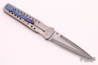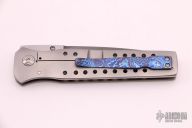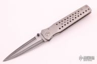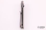 This Framelock folder by KC Gray features a San Mai Damascus blade with false top edge and single thumbstud. The handle has a bead blasted titanium frame with tip up timascus clip. Has some light spots on the blade, otherwise excellent condition.