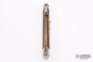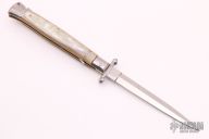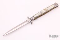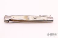 This 11" Swing Guard Auto by Frank Beltrame features a polished dagger/bayonet ground blade with false top edge. The handle has stainless steel bolsters, front and rear, blonde horn scales, brass liners, stainless spring. Has some light scratches, otherwise excellent condition. This one has the flat button.