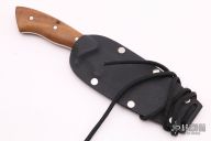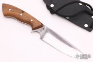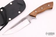 This Knife by Alex Horn, who was an Apprentice under Master Smith Murray Carter, features a two-tone San Mai blade .141 " Blade Stock.  1.135" Blade Depth.  The handle has wood scales and nickel silver pins over a tapered tang construction. Comes with a kydex neck sheath. Has some light scratches, otherwise excellent condition.