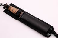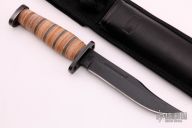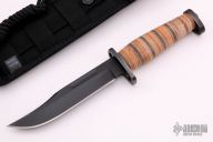 This Model 0119BRS-B by Buck Knives features a black finished clip point blade with false top edge and fullers, .177" blade stock and 1.067" blade depth, hidden tang construction. The handle has a black steel guard and butt, and a stacked leather and black linen micarta grip. Comes with black leather/nylon sheath, original box and papers. Excellent condition.