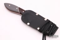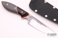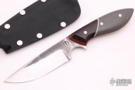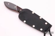 This Knife by Alex Horn, who was an Apprentice under Master Smith Murray Carter, features a two-tone San Mai blade .134 " Blade Stock.  1.062" Blade Depth.  The handle has wood/micarta scales and aluminum pins over a tapered tang construction. Comes with a kydex neck sheath. Has some light scratches, otherwise excellent condition.
