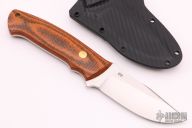 This knife from Dan Crotts features a satin finish drop point blade with a full tang construction. .136" blade stock and 1.171" blade depth. The handle has micarta scales and a single brass pin.  Includes kydex sheath with belt loop set up for horizontal carry. Excellent Condition.
