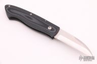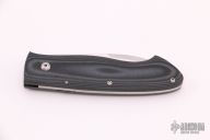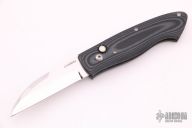 This unusual Corby automatic with a wharncliffe high polish blade and gray/black G10 scales. The trigger button is inset with mammoth ivory . There is a slide safety on the top. Nice lockup, action, and seating. Excellent condition. Comes with a zippered case.