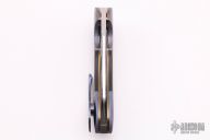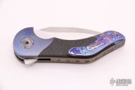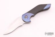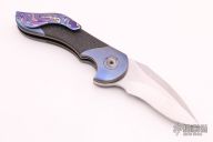 This Føniks Linerlock Flipper by Glenn Are Hovin features a hand rub satin finished blade with false top edge. The handle has orange peel finished anodized titanium bolsters, front and rear, custom milled pivot, carbon fiber scales, titanium liners with jeweled interiors, milled titanium backspacer with hidden screws. Mokuti tip up pocket clip and pivot collars. This knife's only hardware visible is the pivot, every other screw on the knife is hidden, pretty impressive and clean. Nice detent, lockup and blade seating. Includes a padded zippered case. Excellent Condition.