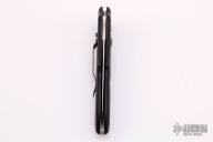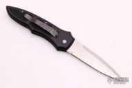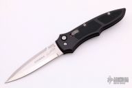 This Cobra side-opening automatic is from the custom series and features a hand ground hand rub satin finished blade by Harold Corby. Coil spring. Sliding safety. Black aluminum frame with black rubber inserts and a black tip down clip. Includes original box. Excellent condition.