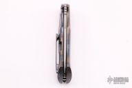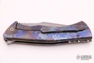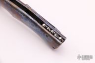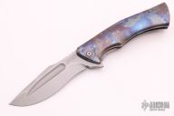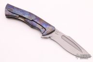 This S5 "Southern Star" is an impressive collaborative knife design from Zieba Knives and Jason Knight. Its rounded titanium frame lock handle is contoured for comfortable use, and has a "Smoke Blue" anodized finish. The knife sports a unique harpoon style recurve blade with stylized grooves and a flipper tab. The knife comes complete with a machined titanium pocket clip for secure tip-up carry. Features: M390 blade steel offers superb edge retention and wear resistance. Titanium handle construction provides a durable, lightweight frame. Steel lock bar insert for secure over-travel protection. Ceramic ball-bearing pivot makes blade deployment a snap. Comes with original box and COA dated 11-09-20. Excellent condition.