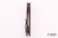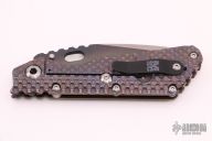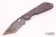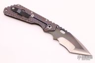 This Mick Strider custom SMF framelock folder has a chisel ground tanto Strike Plate Titanium blade with notched thumbrest and thumbhole. The handle has a double gunner grip anodized titanium frame with laser engraved black titanium clip. Includes Hinderer "Lock Bar Stabilizer" for maximum reverse lock retention. Nice lockup, blade seating and detent. New condition.