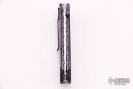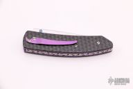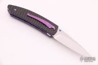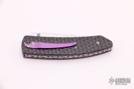 This Scales Release D/A Auto by Thomas Vallotton features a mirror polished blade with fileworked spine and single checkered and anodized titanium thumbstud. The handle has carbon fiber scales, fileworked and anodized titanium liners, fileworked stainless steel backspacer, tip down anodized and jeweled titanium clip. Nice action, lockup and blade seating. Comes with a felt pouch. Excellent condition.