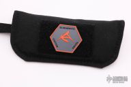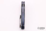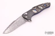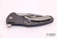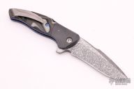 This Origin by Allen Elishewitz features a “Black Snow” stonewashed recurve blade with false top edge, flipper with logo medallion inlay. The handle has zirconium dovetailed bolsters, chatoyant carbon fiber scales with anodized titanium liners with jeweled interiors and textured edges, tip up blasted titanium clip with hidden screws, black G-10 backspacer, anodized titanium hardware, blasted pivot. The button and the edges of the frame are textured. Nice detent, lockup and blade seating. Includes a nylon Velcro case.  Excellent Condition.