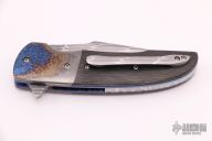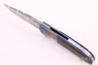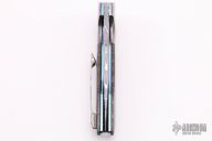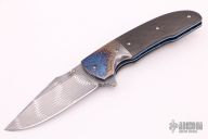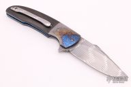 This PL1 by Jaco de Kock features a Vegas Forge Stainless Damascus drop point blade with a matching tip up pocket clip. The handle has Nebula Damascus bolsters and carbon fiber scales over anodized titanium liners.  Sculpted titanium backspacer.   Includes the original box and COA. Has some scuffs and scratches, the finish on the bolsters has been worn off from carry, otherwise good condition.