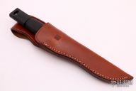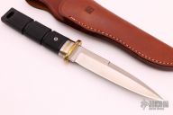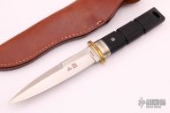 This Shugoto by Al Mar features a satin finished spear point blade with false top edge, .199" blade stock and 1.095" blade depth, hidden tang construction. The handle has a brass guard, black checkered FRN grip, lanyard hole at the butt. Comes with brown leather sheath, original box and papers. Excellent condition. Very hard to find.