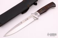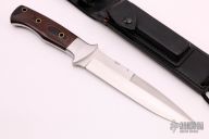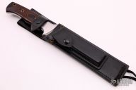 This SERE 6 from Al Mar Knives features a spear point blade with false top edge, .199" stock and 1.362" depth, full tang construction. The handle has black/brown paper micarta scales, brass tube pins over red liners, stainless steel bolsters. Comes with original black leather sheath, the snap for the stone pouch is broken. Has a couple light scratches and a little pitting near the blade spine, otherwise good condition.