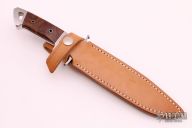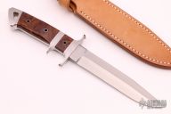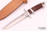 This integral subhilt fighter from Dietmar Kressler features a clip point hand rubbed satin finish blade with sharpened top edge, .203" blade stock and 1.060" blade depth at the ricasso. The handle is comprised of desert ironwood burl insets over red liners and integral construction with full tapered tang. Lanyard tube in pommel. Includes a padded zippered case and brown leather sheath. Excellent condition. A beautiful piece.