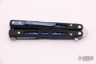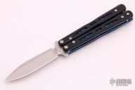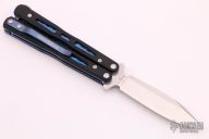 This Model 32 Morpho Balisong by Benchmade has a stone washed spear point D2 stainless steel blade. Handle is black G-10 with blue anodized titanium liners and milled stainless steel spacers. Blue anodized titanium tip up clip. Includes the original box and papers. Excellent condition.