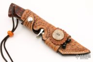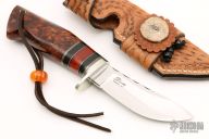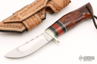This Skinner by D'Alton Holder features a mirror polished blade with fileworked spine, .172" blade thickness and 1.183" blade depth, hidden tang construction. The handle has a nickel silver guard, wood grip with black/nickel silver/wood/red amber spacers. Beautiful combination of materials and excellent workmanship. Comes with a brown leather sheath and padded zippered case. Excellent condition.