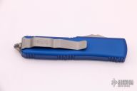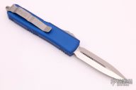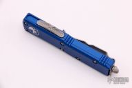 This UTX-85 by Microtech features a dagger style blade. The handle has a blue aluminum frame with blasted hardware and tip down clip. S/N 44696 and dated 08/2019. Comes with original box and papers. Excellent condition.
