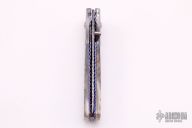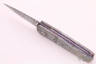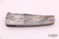 This D/A auto by Doc Hagen features a Damascus blade with fileworked spine, single thumbstud with blue stone inlay. The handle has dovetailed Damascus bolsters, giraffe bone scales, fileworked and anodized titanium liners, fileworked Damascus backspacer, fileworked screws. Nice lockup, action and blade seating. #1123.  When the knife is deployed as an automatic the liner lock can be difficult to disengage. Comes with nylon zippered case. Excellent condition.