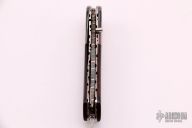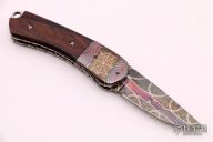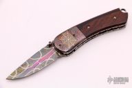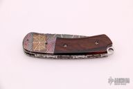 This linerlock from Wayne Whittaker features a drop point Damascus blade with fileworked spine, single thumbstud and ruby inset. The handle is comprised of mosaic Damascus bolsters, cocobolo scales over fileworked titanium liners and fileworked stainless steel backspacer with cocobolo inlays. Nice detent and lockup. Excellent condition. Includes padded and zippered case.