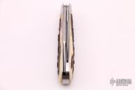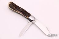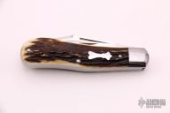 This 2-Blade Dogleg Trapper by the Late Tony Bose features hand-rubbed satin finished blades with nail nicks. The handle has stainless steel bolsters, stag covers with stainless steel shield escutcheon, stainless steel liners and springs. Has half-stops, flush in all positions. Comes with a velcro case. Excellent condition.