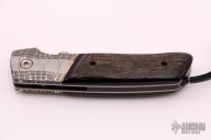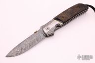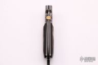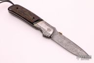This ATCF by Bob Terzuola features a Damascus blade with notched thumbrest and a gold thumbdisc. The handle has multi-bar Damascus bolsters with gold inlays, cape buffalo horn scales, blasted titanium liners, carbon fiber backspacer. Nice detent, lockup, blade seating. Comes with a zippered case. Excellent condition.