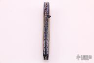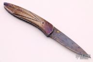 This knife by Frank Niro features a Damascus blade, single thumbstud with a ruby inlay. The handle has heat-colored and carved Meteorite scales, (I'm pretty sure it is meteorite, if it isn't, it is the weirdest Damascus I've ever seen) anodized and fileworked titanium liners, fileworked stainless steel backspacer, the scales have ruby and citrine inlays. Nice detent, blade seating and lockup. Has scratches, otherwise good condition. Comes with a zippered case.
