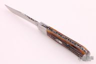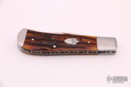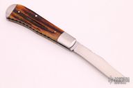 This Single Blade Trapper by Don Morrow features a hand rub satin finished recurve blade with nail nick and fileworked spine. Blade has half stop, flush in all positions. The handle has mirror polished stainless steel dovetailed bolsters, jigged bone covers, stainless fileworked liners and spring, has an engraved acorn stainless steel escutcheon. Excellent condition. Comes with a zippered case.