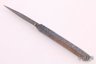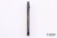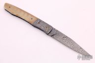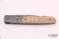This linerlock folder by Cliff Parker features a Damascus blade with a walrus ivory inlaid single thumbstud. The handle has matching Damascus bolsters, walrus ivory scales, anodized and fileworked titanium liners, and a matching Damascus backspacer. Nice detent, lockup and blade seating. Excellent condition. Comes with a zippered case.