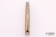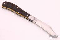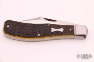 This Slipjoint by Tony Bose (please let us know if you know this model) features jigged bone covers with a stainless shield escutcheon, fluted stainless steel bolsters, stainless liners and spring. Half stop, flush in all positions. Has a satin finished with a nail nick. It includes a padded zippered case. Excellent condition. #6