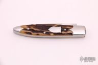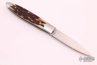 This slipjoint by Hiroaki Ohta features a hand rub satin finished blade with nail nick. The handle has mirror polished stainless steel bolsters, stag covers with stainless steel escutcheon, stainless steel liners and spring, lanyard hole at the butt. Has half-stop, flush in all positions. Comes with a zippered case. Has a few light scratches, otherwise excellent condition.
