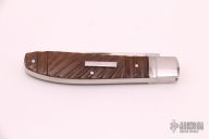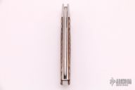 This slipjoint by Hiroaki Ohta features a hand rub satin finished blade with nail nick. The handle has mirror polished and fluted stainless steel bolsters, fluted mammoth ivory covers with stainless steel escutcheon, stainless steel liners and spring, lanyard hole at the butt. Has half-stop, flush in all positions. Comes with a zippered case. Has a few light scratches, otherwise excellent condition.