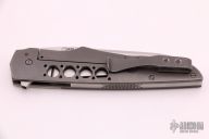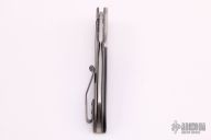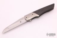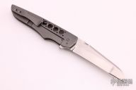 This Wharncliffe flipper by Jason Clark features a hand rub satin finished blade with false top edge and notched flipper. The handle has a single dovetailed titanium bolster, carbon fiber scale, tumble finished titanium liner and lockside, checkered stainless steel backspacer and tip up titanium clip. Nice detent, lockup and blade seating. Has a few light scratches, otherwise excellent condition.