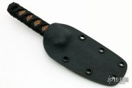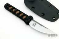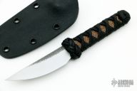 This Fixed Blade by Josh Mason features a satin finished blade, .127" blade stock, .870" blade depth with hidden tang construction. The handle has a Turk's head knot as a guard, and a wrapped handle over brown stingray skin. Comes with a Kydex sheath. New from maker.