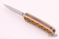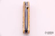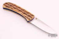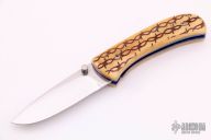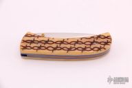 This linerlock by Nate Clark features a mirror polished blade with single thumbstud. The handle has barbwire carved bone scales, anodized titanium liners and backspacer. Nice detent, lockup and blade seating. Has a few light scratches, otherwise excellent condition.
