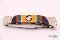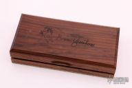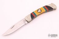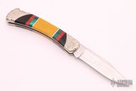 This Buck Model 110 has been customized by Brian Yellowhorse. The blade features a carved clip point blade with a single nail nick, carving makes it look like Damascus kind of. The handle features froward and rear nickel silver bolsters with multi piece scales. Includes original box and papers. Excellent condition. #10/50