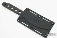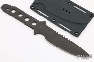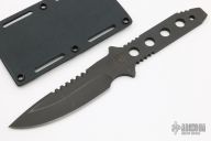 This Strider TAD Gear fixed blade has a black spear point blade with a sharpened and serrated top edge and notched thumbrest, .196" blade stock and a blade height of 1.278", full skeletonized tang with lanyard hole in pommel. Includes kydex sheath. Has a few light scuffs, otherwise excellent condition.