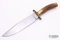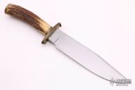 This Bowie from Don Fogg features a hand rub satin finished clip point blade with false top edge and maker's mark inset in ricasso, .236" blade stock and 1.619" blade depth, hidden tang construction. The handle is comprised of a brass guard and pommel with a stag grip. Has some oxidation spots on the blade and a few light scratches, otherwise good condition. Includes padded and zippered case.