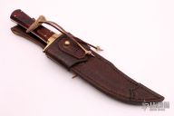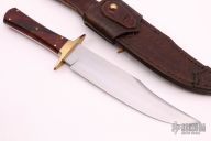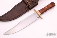 This Bowie by Mark Banfield features a hand rub satin finished blade false top edge, .194" blade stock and 1.735" blade depth, full tapered tang construction. The handle has a bronze guard, desert ironwood scales with brass pins. Comes with a hand tooled brown leather sheath with stud and also optional Frog with belt loop. Excellent condition. Comes with a zippered case.