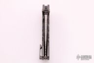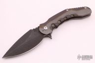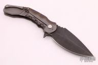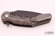 This Meglodon flipper from DSK Tactical Knives features a dark tumbled spear point blade with notched thumbrest and flipper. The handle is constructed of milled, flamed and tumbled titanium frame, blasted titanium backspacer and tip up clip. Blade is centered when closed, flips well with no wrist action needed. Comes with original zippered case and COA. Excellent condition.