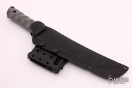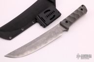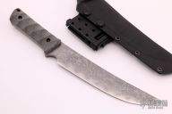The "OKEHAZAMA" by Kiku Matsuda features a heavy duty upswept OU-31 Hamaguri-ba Tanto blade with taper grind on back and a sharp Kissaki tip, .240" blade stock and 1.535" blade depth, full tang construction with hand contoured black canvas micarta scales. Comes with hand fitted "SUNLOID KD" sheath. SUNLOID KD is an Acrylic-PVC Alloy Plate made by SUMITOMO BAKELITE. Excellent condition.