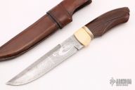 This awesome fixed blade by Roger Bergh features a mosaic Damascus blade with a false top edge, .190" blade stock and 1.325" blade depth, hidden tang construction. The handle has a mammoth ivory guard and a grip consisting of Arizona desert ironwood with a walrus ivory spacer, grip is carved and very striking. Comes with a hand tooled brown leather sheath, very striking on its own. Excellent condition. Comes with zippered case and COA.