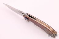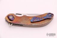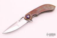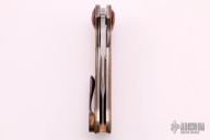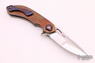 This Wayfarer Compact from Olamic Cutlery features a two tone blade with polished grinds and satin flats. The blade has a swedge, notched thumb rest and flipper. The handle is comprised of hammered copper scales over titanium liners and hammered copper backspacer. Timascus pivot collars and tip up clip. Includes padded and zippered case and maker's card dated 10-24-16. Excellent condition.