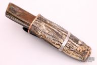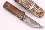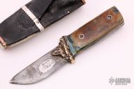 This skinner by Miles Martin features a Damascus blade forged  with an etched wolf and cat, has copper and bronze forged into the blade, .091" blade stock and 1.06" blade depth, full tang construction. The handle has a cast copper and bronze guard with mammoth ivory scales.  The sheath is composed of mammoth, copper, silver and kydex.  New from maker.