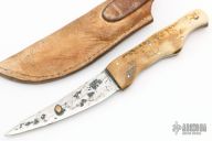 This hunter by Miles Martin features a forged 1095 steel blade with copper/brass inlays and a full tang construction. .082"  Blade Stock.  1.16" Blade Depth.   The handle features mammoth ivory scales.  Includes a brown Leather sheath. New from maker.